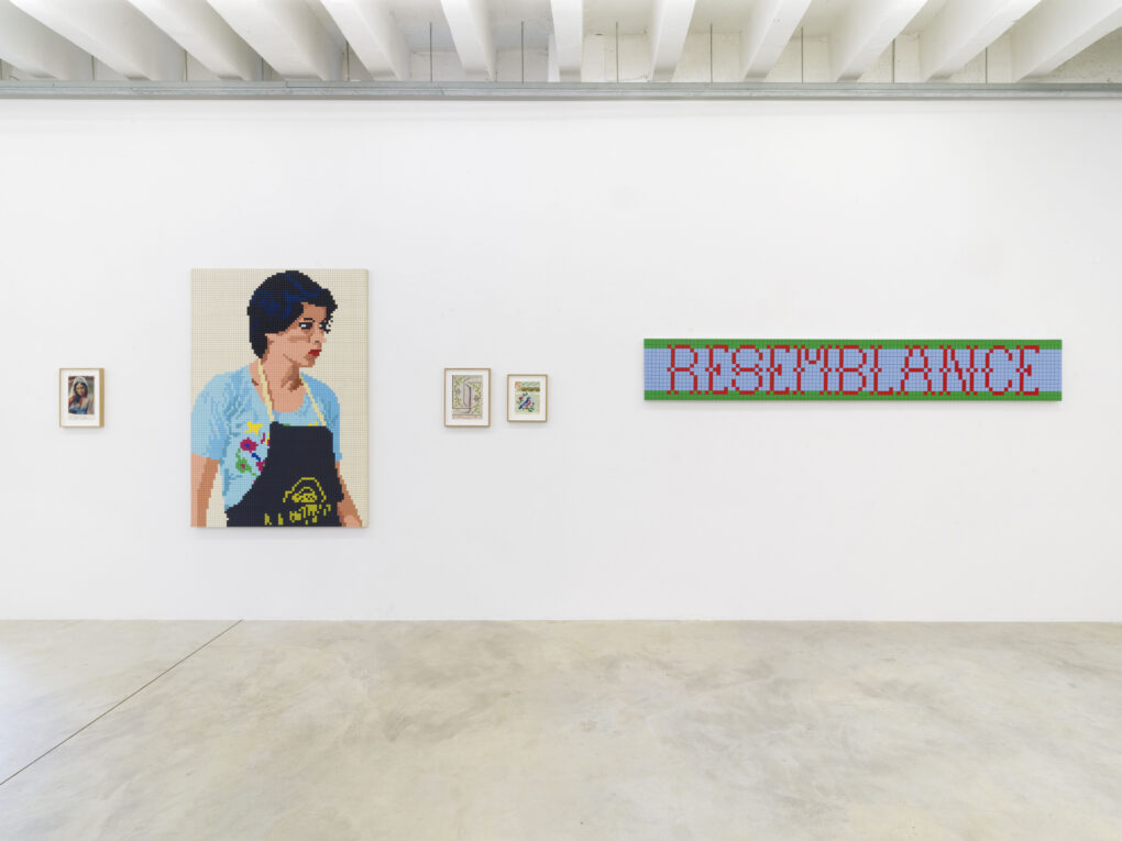 By observing the works on display, a discernible grid structure emerges, a framework Voigt skillfully employs and which he copied from his mother’s embroidery work. The pieces on display not only demonstrate Voigt’s adeptness at drawing from textile works but also underscore his unique departure from the traditional modernist – that is, abstract – approach to the grid. In his practice, the grid is not used to replace the figurative image; rather, it serves as a formal tool for representing it, similar to the way it is utilized in embroidery. The developments of recent decades, especially with regard to the emergence of feminist art history, have proven the textile medium to be historically significant medium, and allow Voigt’s works to be viewed from a different angle and re-evaluated. Drawing from the traditionally female-associated medium of textile art, Voigt’s works simultaneously predict the advancement of the digital age. Through his practice, he deftly maneuvers the course of time, succinctly demonstrating the benefits of embracing new perspectives.